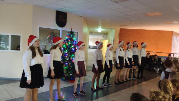 Daug pastangų įdėta, kad eglutė įsižiebtų, tačiau kol vaikai neparodė savo meninių sugebėjimų, neužsidegė nė viena lemputė. Visiems susirinkusiems dainavo choras „Šypsenėlė“, 5-6 klasių merginų ansamblis, 3-4 klasių mokiniai grojo fleitomis. Visi susirinkusieji labai nuoširdžiai mokėsi skaičiuotę, kuria prašė sniego, dainavo apie eglutę, ir tik tada ji sužibėjo margaspalvėmis švieselėmis...